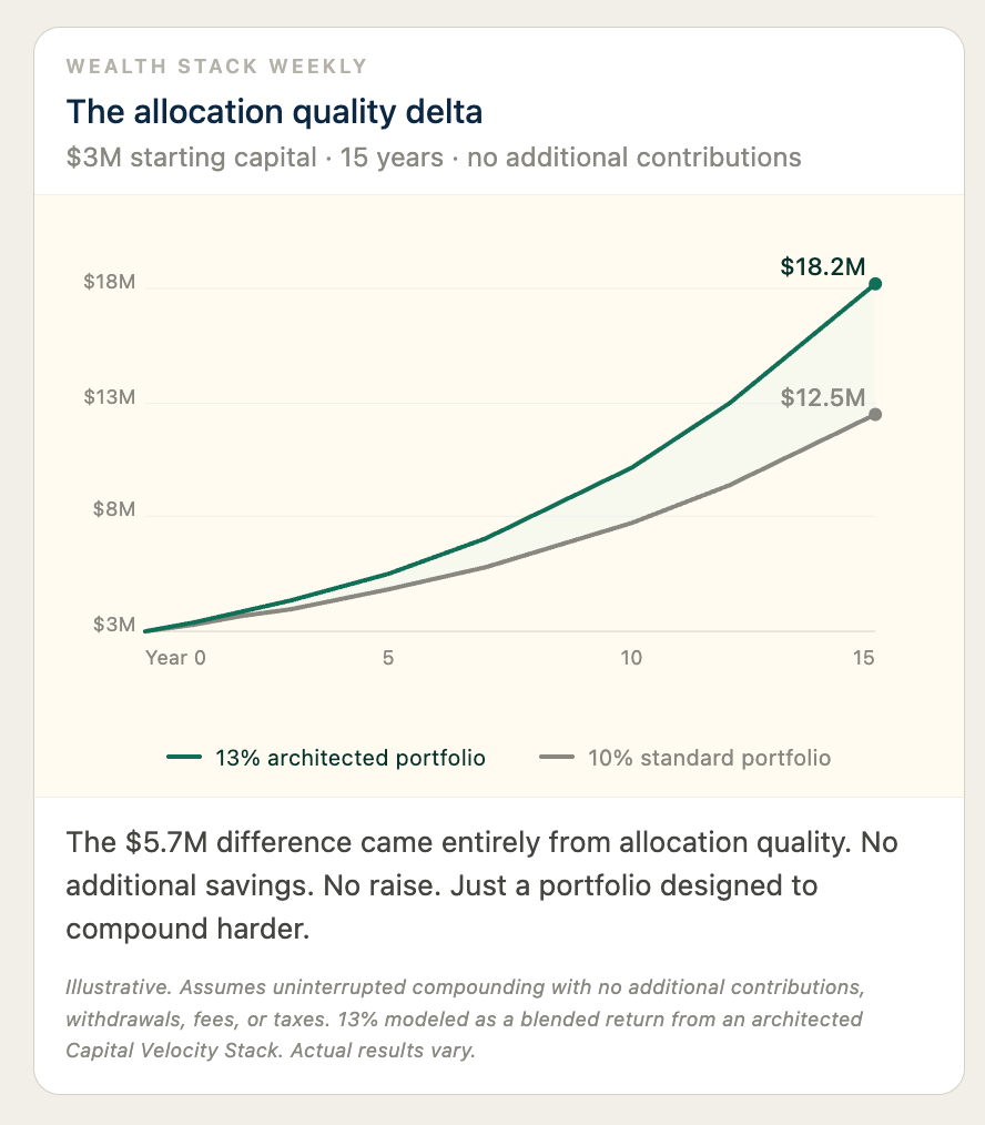 A portfolio of $3 million compounding at 10% for 15 years reaches roughly $12.5 million. Improve that compounding rate by 3 points through better architecture, and the same $3 million reaches over $18 million. That delta — the $5.5 million difference — came entirely from allocation quality.