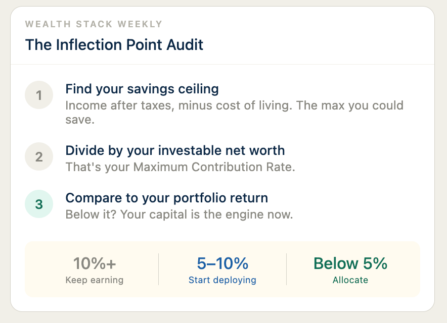 This is what it means to be an allocator. And the inflection point math tells you exactly when you've arrived. When your Maximum Contribution Rate (the most you can save, divided by your investable net worth) drops below 5%, your capital is structurally the dominant driver of your wealth. The quality of your allocation decisions matters more than anything your paycheck can contribute.