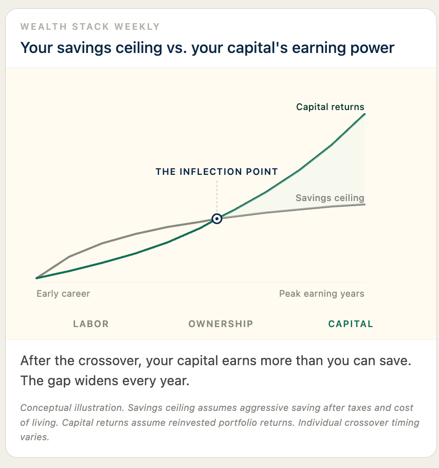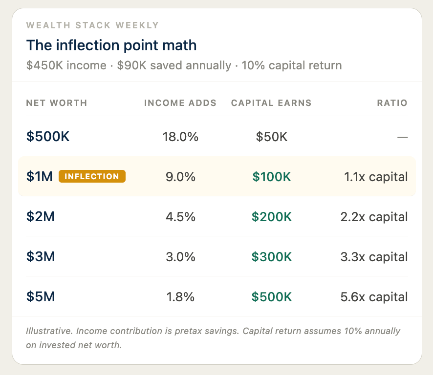 That crossover, the point where your capital's earning power structurally exceeds your savings ceiling, is your inflection point. For most high earners, it arrives somewhere between $1 million and $2 million in investable assets.